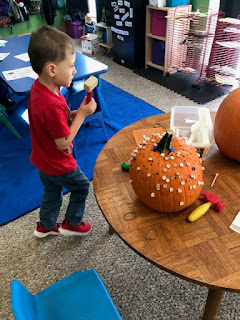 We used toy hammers and wooden pegs to hammer into our pumpkin.