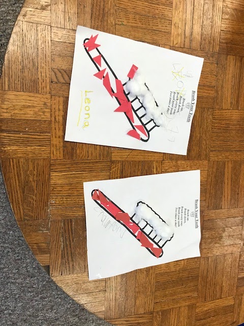 We used scraps of paper and cotton balls to create our toothbrushes. Then, we sang our song, "Brush up, brush down, brush every way. Brush your teeth two times a day!"